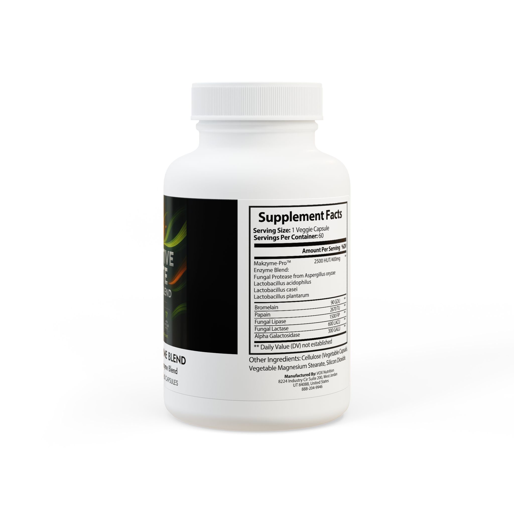 Active: Makzyme-Pro™ Enzyme Blend: Fungal Protease (from Aspergillus oryzae), Lactobacillus acidophilus, Lactobacillus casei, Lactobacillus plantarum, Bromelain, Papain, Fungal Lipase, Fungal Lactase, Alpha Galactosidase